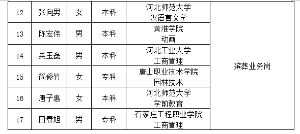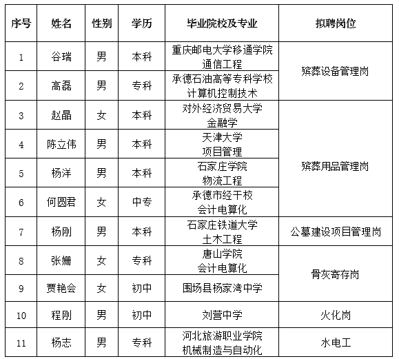 因公司發(fā)展需要,承德市國(guó)瑞置業(yè)有限公司委托第三方機(jī)構(gòu)面向社會(huì)公開(kāi)招聘殯儀館運(yùn)營(yíng)各崗位人員17名?,F(xiàn)對(duì)擬錄用人員信息進(jìn)行公示,公示期間如有異議,可通過(guò)電話、信函等方式反映,反映意見(jiàn)請(qǐng)署真實(shí)姓名。